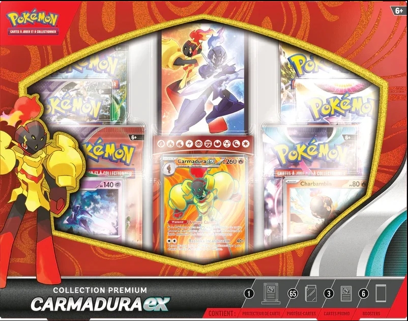 Cartes en Français. Produit officiel par The Pokémon Company. Vous achetez un Collection Premium Carmadura-ex en Français Pokémon JCC.